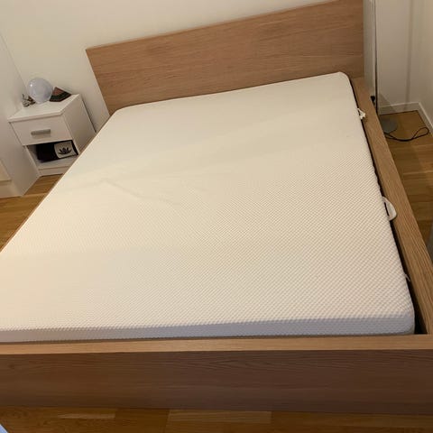 Madrass 160x200cm. Den är använd men har alltid haft bäddmadrass + madrasskydd så den är i gott skick. Ben medföljer och går att skruva av.