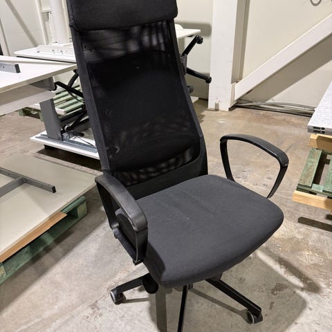 Kontorsstol i svart tyg med hög rygg. Stolen har hjul och justerbar sitthöjd. Passar för användning vid skrivbord eller arbetsplats i hem eller kontor.