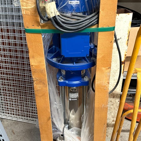 DP-Pumps DPK-E 1-110 vattenpump. Vertikal flertrins centrifugalpump av metall med blå motorenhet och rostfri pumpdel. Avsedd för vattenförsörjning, tryckstegring eller cirkulation i exempelvis fastigheter eller anläggningar där stabilt vattentryck behövs. Typbeteckning enligt märkplåt: DPK-E 1-110.