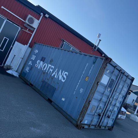 Fristående fraktcontainer i stål, målad i vit färg. Containern har dubbeldörrar på kortsidan med låsregel.