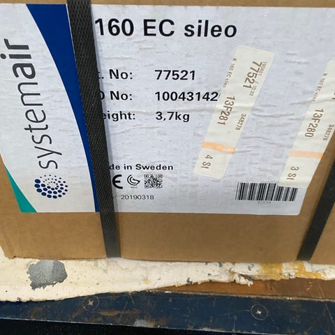 Systemair TFER 160 BLACK takfläkt i svart utförande. Fläkten är avsedd för montage på tak och har rund anslutning med diameter 160 mm. Enligt märkplåten drivs den med 230 V, 50 Hz och har en effektförbrukning på 0,28 A. Fläkten är lämplig för ventilation av exempelvis mindre lokaler, förråd eller liknande utrymmen där takmonterad frånluftsfläkt behövs. Yttermått på monteringsplattan framgår delvis av bild med måttband och kan användas som referens vid planering av installation.