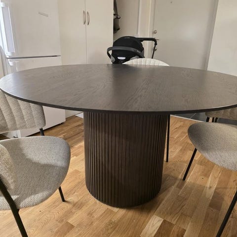 Diameter is 120cm. It comes with 5 Sharon Karmstol.