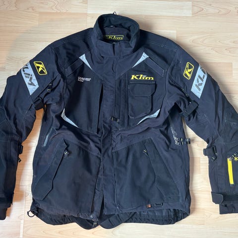 Storlek på jacka och byxor är stl 38. Finns ett par extra byxor som är lite större som följer med. Två par mc handskar, ett par varmare och ett par svalare. Skor i storlek 38 och en hjälm i märket Shoei med monterat intercom.