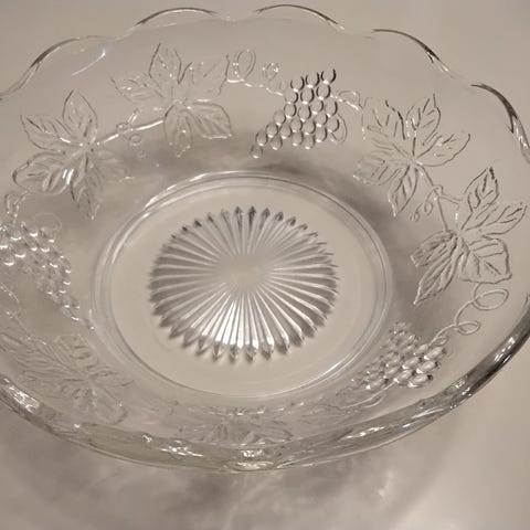 glasskålar med blommönster. Skålarna är genomskinliga med pressat blommotiv i botten och längs kanten. Passar för servering av exempelvis dessert, snacks eller mindre tillbehör vid måltider. Tillverkade i glas och kan staplas för enklare förvaring.