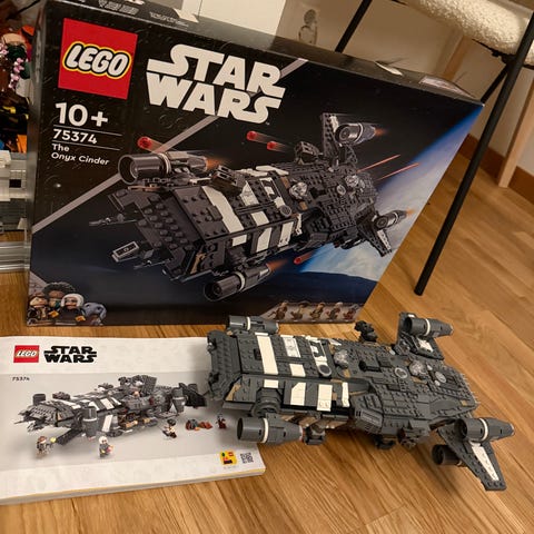 Lego Star Wars rymdskepp byggsats i grå nyanser. Modellen föreställer ett större rymdskepp med detaljerad skrovkonstruktion, motorsektion och kanoner. Passar för bygge, lek eller som utställningsmodell för den som samlar på Lego Star Wars-set. Byggsatsen består av Lego-klossar i främst grå färg med inslag av andra färger för detaljer som motorer och vapen. Har tyvärr inte kvar ritningen men finns att hitta på nätet digitalt. Kan vara så att någon bit saknas och därmed ett lägre pris.