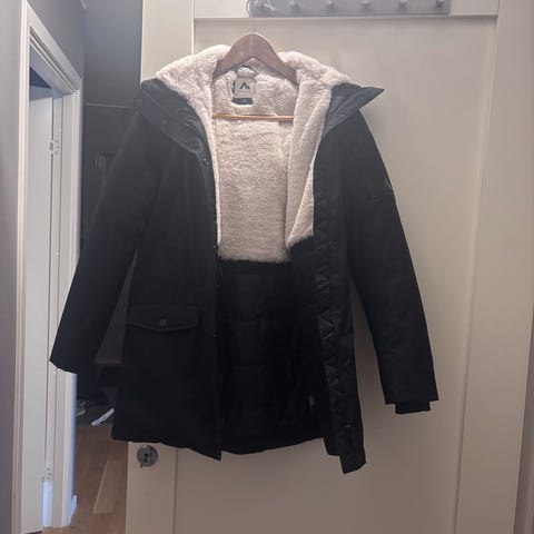 Jackan har sydda kanaler som är vadderade med värmande polyester. Den höga kragen och avtagbara huvan ger extra skydd mot kalla vindar och fallande snö. I sidorna finns smidiga fickor med tryckknapp för förvaring av småsaker.