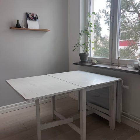 Englesson matbord och 4 matstolar. Matbord med 2 uppfällbara skivor som förlänger bordet. Mittsektionen är 65 cm och vardera skiva som förlänger är 60 cm. Total längd blir 185cm.