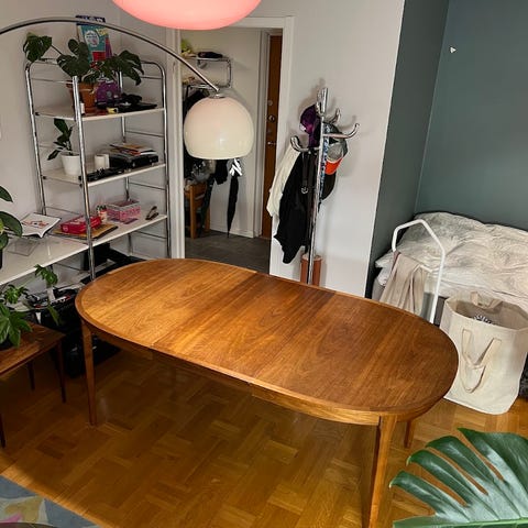 Teakbord med iläggsskiva. All info finns bland bilderna.