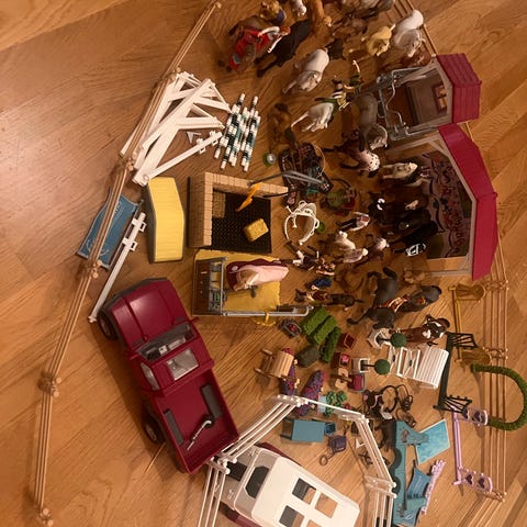 Schleich leksakshästar figurer. Set med 19 Schleich hästfigurer (varav 8 föl) i olika storlekar och färger, avsedda som leksaker eller samlarfigurer. Passar för lek, samling eller som dekoration i stall- och gårdsmiljöer. Tillverkade i plast med målade detaljer.