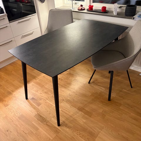 Sharp matbord. https://www.mio.se/p/sharp-matbord-140x85x74-cm/319456?id=M2038407 Sharp är ett bord i laminat som är extra tålig och mer beständig mot repor och vätskor. Benen är i lackerad metall.