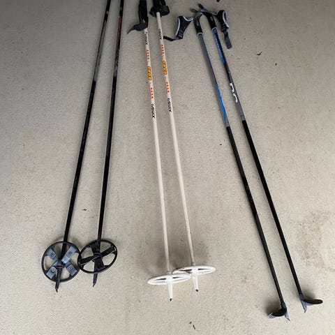 Skidorna är klassiska längdskidor med bindningar anpassade för medföljande pjäxor. Pjäxorna är svarta och märkta med storlek 38.
