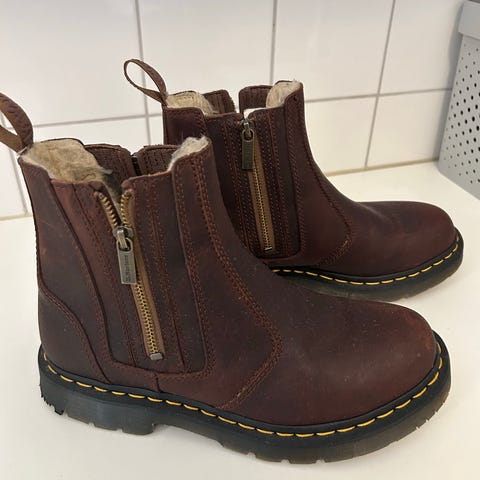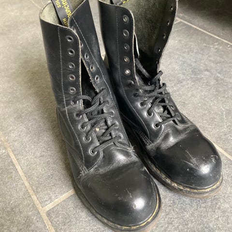 Dr. Martens stövlar i svart färg, storlek 42. Klassisk snörning framtill och karaktäristisk sula. Passar som vardagssko eller för mer robust användning beroende på behov och väderförhållanden.