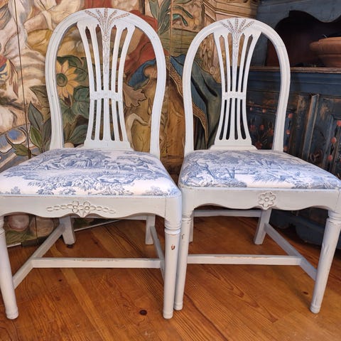 2 stolar är målade i en ljusblå nyans och nytapetserade i klassisk Toile de Jouy-tyg i bomull.