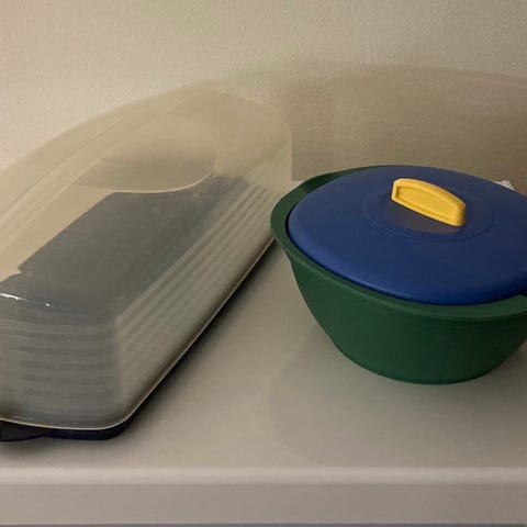 En blandning av nya och varsamt använda Tupperware förvaringsburkar.