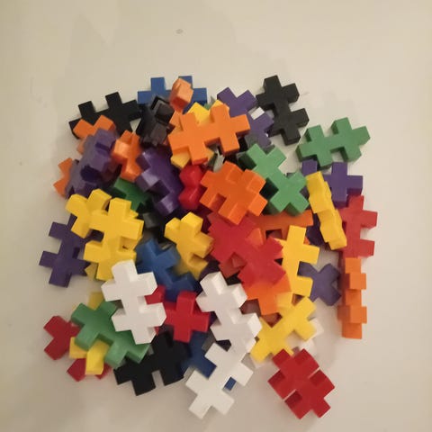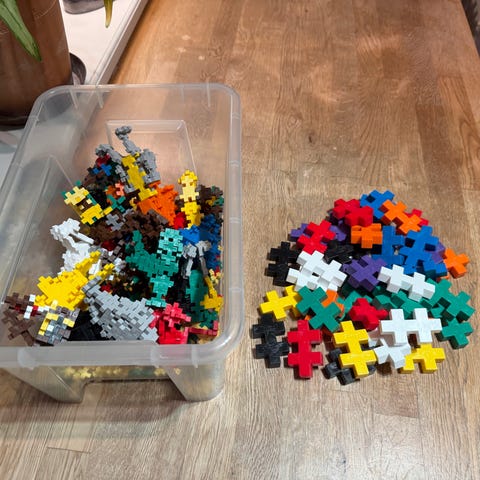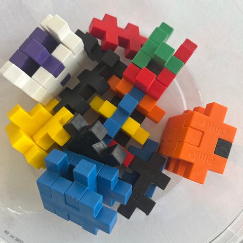Säljer Plus Plus byggbitar i mixade neonfärger som konstruktionsleksak för barn som tycker om att bygga och skapa egna modeller.