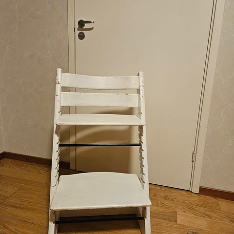 Stokke Tripp Trapp barnstol i svartmålat trä. Stolen har justerbar sits och fotplatta som kan flyttas i höjdled efter barnets storlek. Övre bygel/babydel i plast ingår enligt bild. Klassisk konstruktion som gör att barnet kan sitta vid ett vanligt bord. Passar från småbarnsålder och uppåt beroende på montering av tillbehör och inställning av sits och fotstöd. Färgen är avskavd på vissa ställen, se bilder.