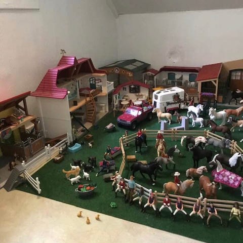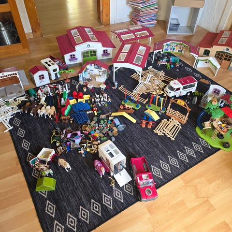 Olika set med byggnader, tillbehör, staket, andra djur, figurer. En salig blandning helt enkelt. Ca 108 hästar av märket sleich!