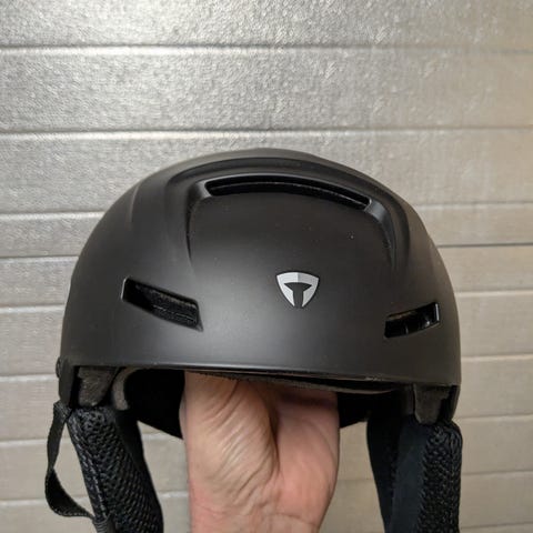 Skid och snowboardhjälm med integrerat visir i spegelglas. Hjälmen är svart med justerbart hakband och ventilationsöppningar. Storlek 57-59