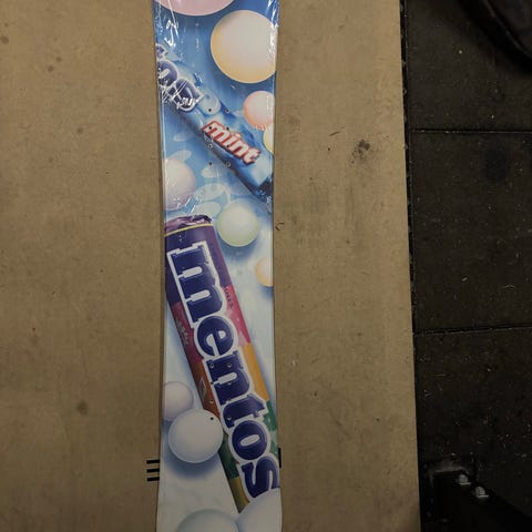 Mentos snowboard med grafiskt tryck i flera färger. Brädan har stor Mentos-logotyp på ovansidan och undersidan med färgglad design. Lämplig som snowboard för åkning eller som dekorativ samlarpryl.