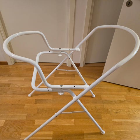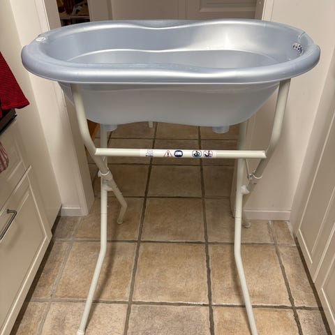 Kaxholmen badbalja i grå plast med tillhörande stativ. Baljan har ergonomisk form och löstagbart insatsstöd för spädbarn. Utrustad med propp i botten för enkel tömning samt halkskydd på undersidan av insatsen. Stativet är hopfällbart metallstativ som håller baljan i bekväm arbetshöjd vid bad av baby.