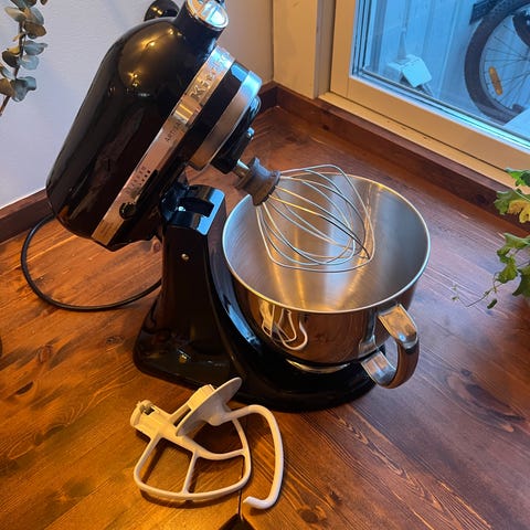 KitchenAid köksmaskin i blå färg med rostfri bunke. Maskinen är en bänkmixer/standmixer med lyftarm för bunken. Medföljer gör rostfri skål med handtag samt standardtillbehör för blandning och vispning. På bilderna syns även ett riv- eller skärtillbehör med olika trummor/insatser för att riva eller skiva matvaror. Passar för bakning, matlagning och förberedelse av olika degar, smeter och rivna ingredienser i köket.
