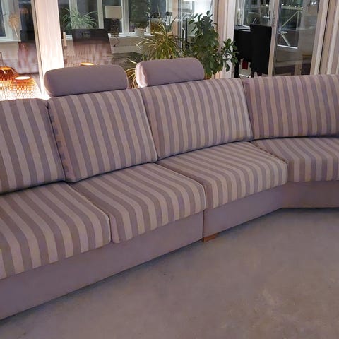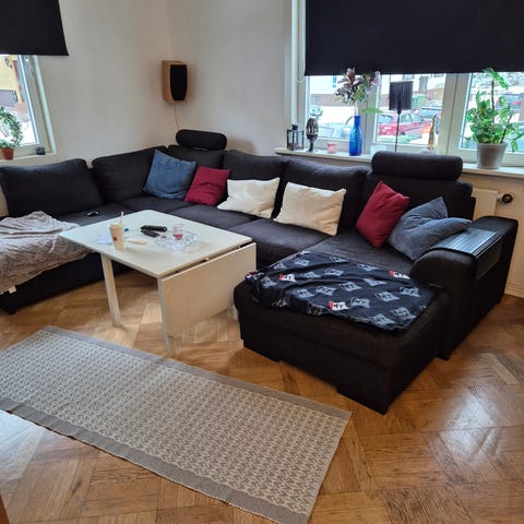 Mörkgrå IKEA hörnsoffa. Soffan har flera sittplatser och är utformad i vinkel. Klädseln är i textil och soffan står på ben som ger viss markfrigång under. Fotpallen ingår!
