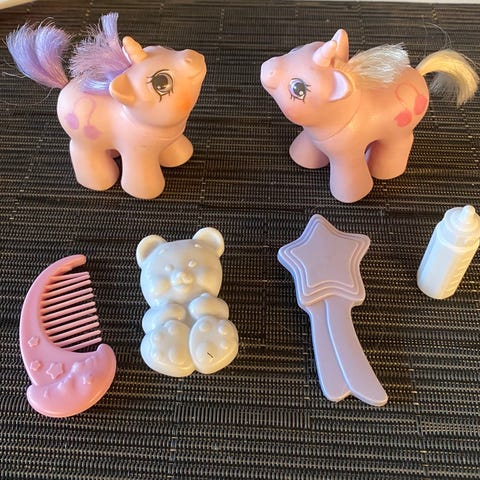 My Little Pony hästfigurer i plast i olika storlekar och modeller. Setet innehåller flera ponnyer i blandade färger, vissa är lite mer slitna än andra. Lämpliga som leksaker för barn eller som samlarfigurer. Figuren står fristående och kan användas i rollekar och som dekoration i barnrum.