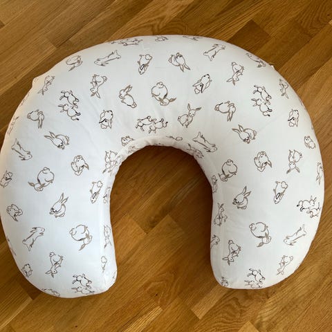 IKEA amningskudde i C-form, vit med diskret mönster. Kudden är utformad för att ge stöd vid amning eller flaskmatning och kan även användas som stöd för barnet när det sitter eller ligger. Yttermaterialet är tyg och kudden är fylld med mjukt stoppningsmaterial för bekvämt stöd.
