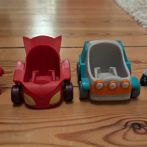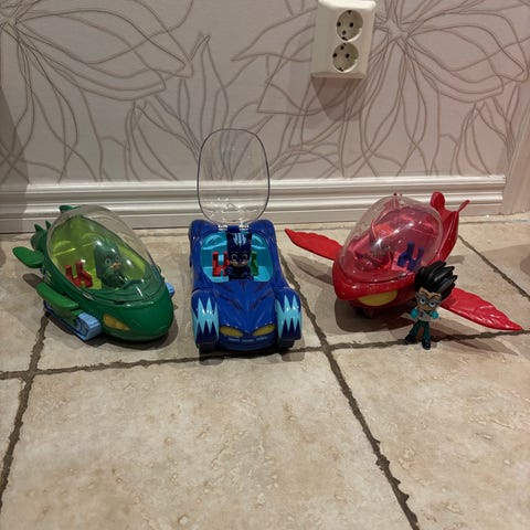 Tre pyjmashjältar med bil i bra skick.