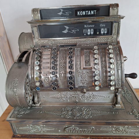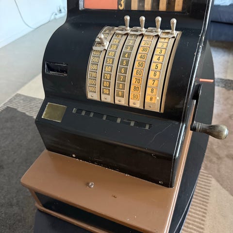 Mekanisk kassaapparat i brun färg. Utrustad med knappar för olika belopp och en utdragbar kassalåda. Passar som inredningsdetalj, samlarobjekt eller rekvisita. Exakt märke och modell är okänt.