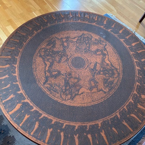 Dansk möbeldesign SOFFBORD med dekorerade med keramiska plattor i orange/brun/röd färg i teak från 1960/1970-tal.