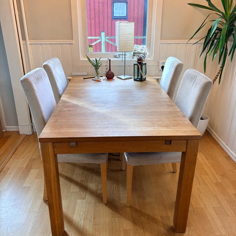 Mio matbord i ekfaner med rektangulär bordsskiva och rundade hörn. Bordet har fyra smala ben med mjukt formade övergångar mot bordsskivan. Passar som matbord eller arbetsbord i kök eller vardagsrum. 185 cm lång skiva som kan förlängas med två skivor som inte ingår men finns på Mio möbler. Som nytt, under halva priset inköpt 2025.