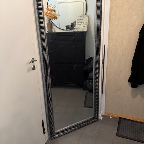 Ikea spegel med helkroppsformat och svart ram. Rektangulär modell som kan placeras stående mot vägg eller monteras på vägg beroende på önskemål. Passar i hall, sovrum eller andra rum där en större spegel önskas.