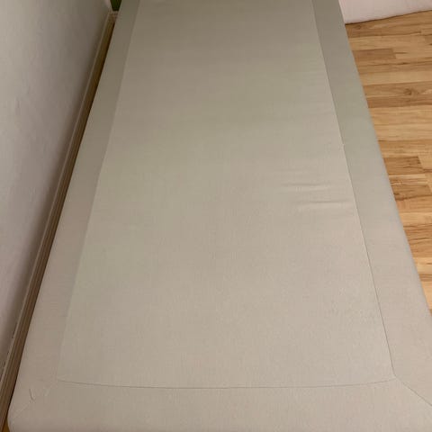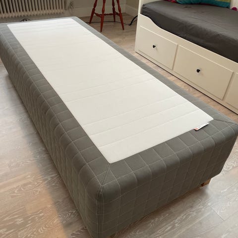 Jysk säng, Gold 50, med förvaring i grått tyg. Sängarna har uppfällbar botten med gott om förvaringsutrymme under liggytan. Öppningsmekanismen är försedd med gasfjädrar som håller botten uppe vid öppning. Sängarna har en ljus madrass/topp ovanpå den vadderade sängramen. Passar som dubbelsängar i sovrum, gästrum eller tonårsrum där extra förvaring önskas under sängarna.