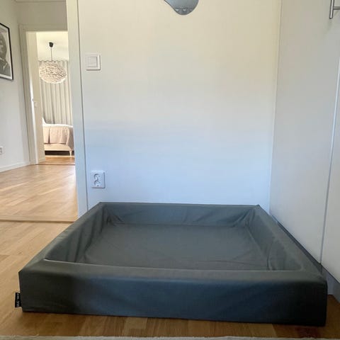 Hundsäng med trästomme och grön kudde Miwo design