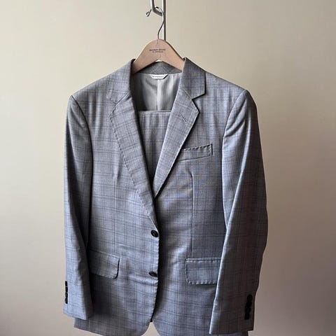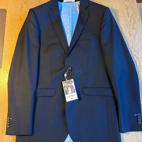 Bläck kostym för herr i storlek 48. Kostymen är blå och tillverkad i ull. Klassisk modell med slag och framfickor.