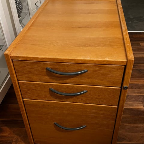IKEA hurts med tre lådor i ljus träfärg. Översta lådan är låsbar och har nyckel, de två nedre lådorna är större för förvaring av exempelvis pärmar, dokument eller kontorsmaterial. Utrustad med metallhandtag på samtliga lådor. Passar som förvaring vid skrivbord eller i kontor och hemmamiljö där extra lådförvaring behövs.