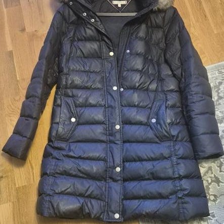 Hollister dunjacka för dam i storlek 40. Jackan är beige och har quiltad design med huva med päls.Midjebälte och flera fickor framtill. Ytterplagg i dun som passar för kallare väder.