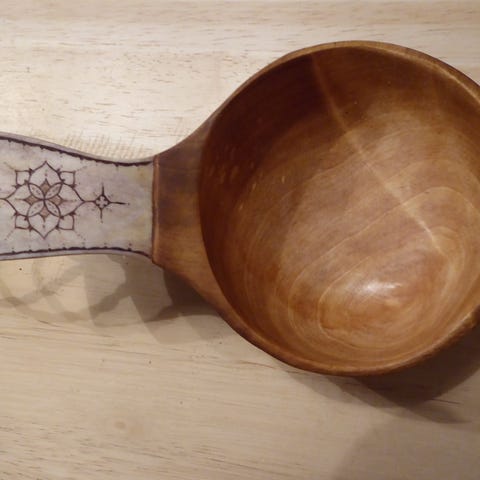 Träkåsa mugg med snöre. Kåsan är tillverkad av björkträ och har ett handtag med snöre för upphängning eller fäste i ryggsäck. Passar för dryck ute i naturen, exempelvis vid vandring, camping eller friluftsliv. Formen ger ett bra grepp och den släta insidan gör den lämplig för både varma och kalla drycker.