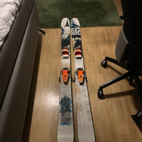 Atomic alpina alpina skidor med längd cirka 180 cm. Skidorna har blå och vita detaljer samt gula bindningar. Passar för utförsåkning. Lämpliga för vuxna eller längre ungdomar beroende på åkarens längd och vikt. Skidorna är utrustade med justerbara bindningar som kan anpassas efter pjäxstorlek.
