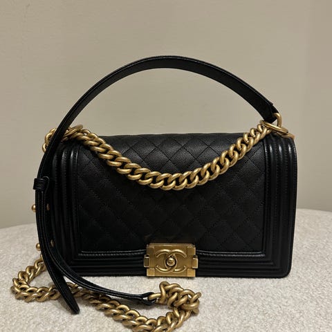 Chanel Boy Bag för kvinna i svart läder. Väskan har quiltad framsida och baksida med dekorativa sömmar och en metallspänne framtill. Axelremmen består av en kombination av kedja och läder, vilket gör att väskan kan bäras över axeln eller tvärs över kroppen. Modellen är kompakt och lämpar sig för förvaring av mindre personliga tillhörigheter som plånbok, mobiltelefon och nycklar. Insidan är uppdelad i fack som hjälper till att hålla innehållet organiserat. Passar för vardagsbruk och mer uppklädda tillfällen.