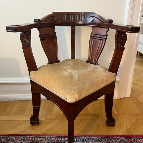 Trästol med armstöd och mönstrad sits i rosa och beige tyg. Stolen har en klassisk rygg med utskuren dekor och böjda ben. Passar som matstol, skrivbordsstol eller som extra stol i vardagsrum eller hall.