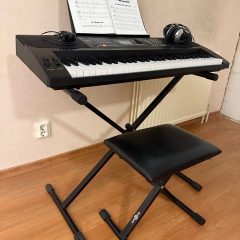 Yamaha PSR-270 keyboard med nätadapter PA-1. Elektroniskt tangentbord med inbyggda högtalare, display och funktionsknappar för olika ljud, stilar och inställningar. Drivs via medföljande nätadapter. Lämpligt för övning, hemmabruk och enklare musikproduktion.