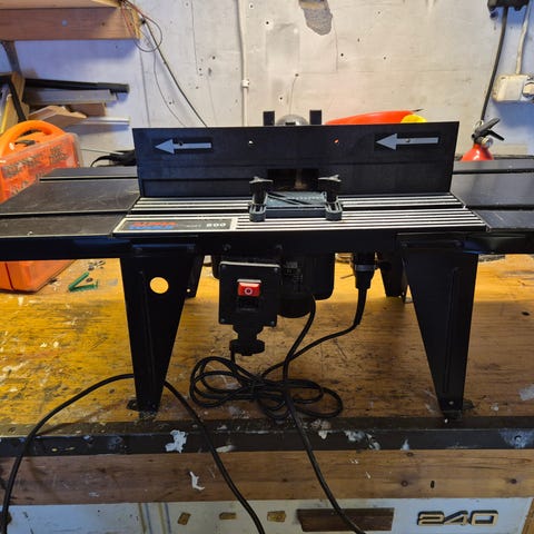 Meec kombinerad plan- och rikthyvel i grå färg. Maskinen är avsedd för hyvling och riktning av trädetaljer och har planhyvelbord ovanpå samt rikthyvelbord som kan fällas upp. På bilderna syns anslutning för spånsug, skyddskåpor, inställningshandtag och tillhörande verktyg. Lämplig för träbearbetning i hobbyverkstad eller mindre snickeri.
