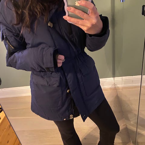 Svart vinterjacka för dam i storlek XS. Jackan har huva med bred pälskant och går ned över höften. Modellen går att stänga på två olika sätt som jag visar på bild. Jackan är köpt på Nk. Den varmaste jackan jag har ägt!