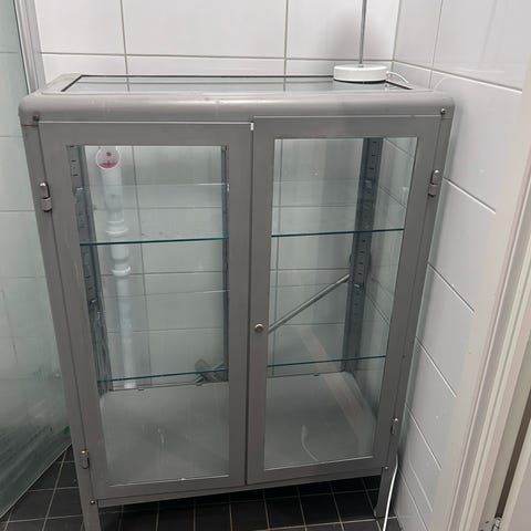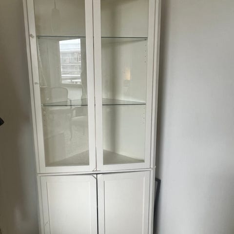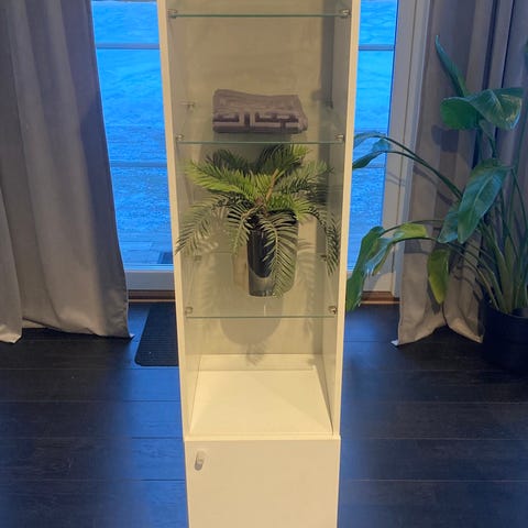 Vitt vitrinskåp med glasdörrar och flera hyllplan i glas. Skåpet är fristående och lämpar sig för förvaring och exponering av exempelvis porslin, prydnadssaker eller andra föremål. Passar i vardagsrum, kontor eller andra utrymmen där man vill ha överskådlig förvaring bakom glas.