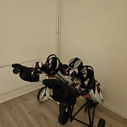 Golfset med bag i svart och grå färg. Setet innehåller flera järnklubbor samt headcovers. Bagen har flera ytterfack för förvaring av tillbehör och bärhandtag upptill. Passar för golfspelare som söker ett komplett set med klubbor och bag för spel på bana eller träning på range.