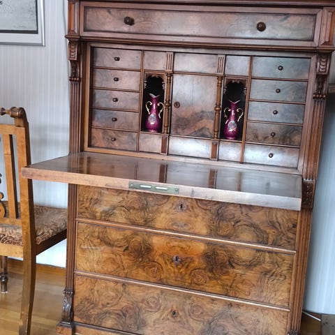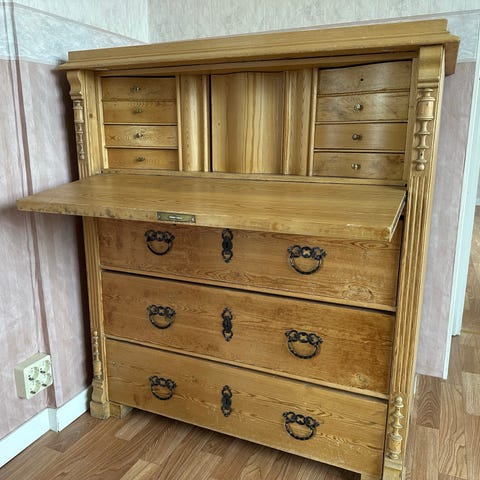Sekretär i form av byrå i brunt trä. Möbeln har överdel med nedfällbar skrivskiva som döljer flera små lådor och fack för förvaring. Under delen består av tre större utdragslådor. Sidor och front är i massivt trä med synlig ådring. Beslagen är i mörk metall med dekorativ utformning. Passar som skrivplats och förvaring i exempelvis vardagsrum, sovrum eller hall.