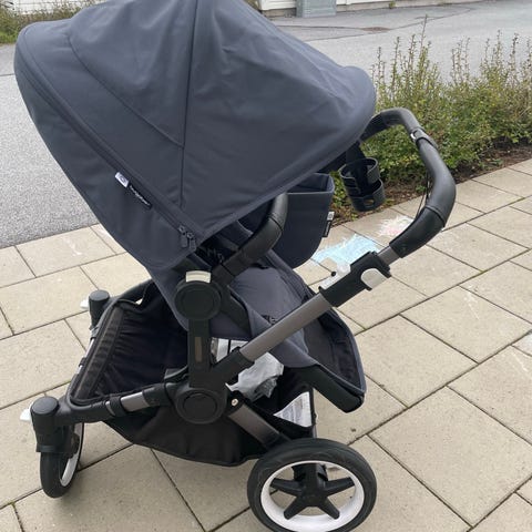 Bugaboo barnvagn i grått tyg med svart chassi. Vagnen har sittdel med fempunktssele, bygel och justerbart ryggstöd. Stor sufflett ger skydd mot sol och vind. Under vagnen finns en varukorg för förvaring. Handtaget är ergonomiskt utformat och hjulen är svängbara framtill för enklare manövrering. Passar för vardagsbruk och promenader i stadsmiljö.