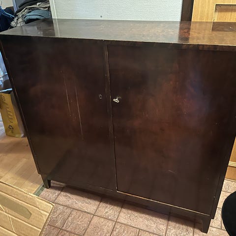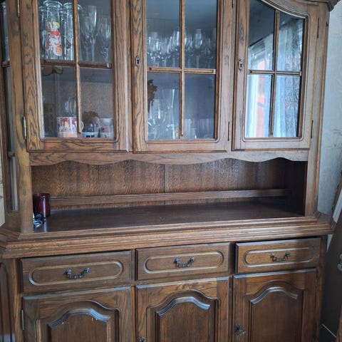 Rejält Antikt vitrinskåp/byrå/"pjäs" och dekorativa sniderier på dörrarna. Skåpet står på svängda ben och har en övre skåpsdel med justerbara hyllor med dubbeldörrar samt en nedre del med två lådor för extra förvaring. Passar som förvaringsmöbel i vardagsrum, matsal eller sovrum för porslin, textilier eller andra föremål.